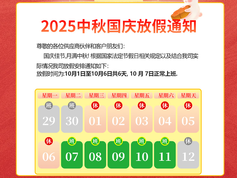 尊敬的各位供應商伙伴和客戶朋友們:國慶佳節(jié),月滿中秋!國慶家園月圓人團園,國慶中秋雙節(jié)共歡騰!在此預祝大家度過一個輕松、愉快的假期.根據(jù)國家法定節(jié)假日相關(guān)規(guī)定,再結(jié)合我司實際情況,現(xiàn)將2025年國慶中秋節(jié)放假安排通知如下:放假時間定為10月1日至10月6日(星期三至星期一),共計6天.2025年 10月 7日(星期二)正式上班,假日期間如有業(yè)務需求可電話咨詢業(yè)務,感謝大家的理解與配合!秋高氣爽迎中